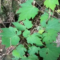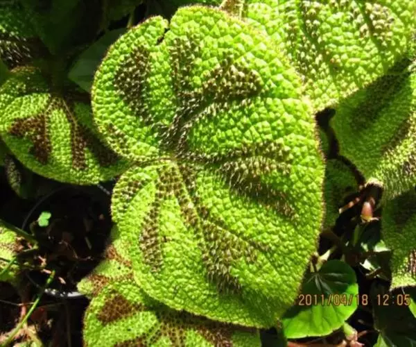 年生草本,根茎横卧,肉质;叶具长柄,通常1片,密被粗、褐色卷曲硬毛,均基生;叶片轮廓宽卵形至斜近圆形,先端极尖或短尾尖,叶缘有不规则锯齿,基部呈深心形,长16-20厘米,宽约12厘米;叶片上表面深绿色,伴有浅色斑纹,下表面淡褐绿色,表面有独特的泡状突起和刺毛,掌状5-7条脉,侧脉达边缘。