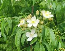 白蔷薇系直立灌木植物,高约2米;小枝有不等钩状皮刺,有时混有刺毛。小叶通常5,稀7,宽椭圆形或卵形,稀长圆卵形,长2-6厘米,边缘有单锯齿,下面被毛,托叶宽,半边有锯齿。