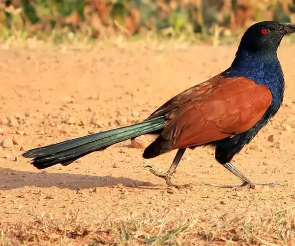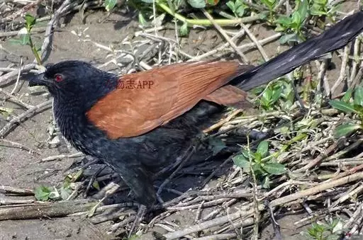 褐翅鸦鹃虹膜赤红色(成鸟)或灰蓝至暗褐色(幼),嘴、脚黑色。