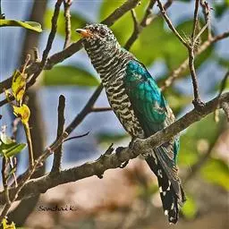 斑翅凤头鹃: 成鸟具羽冠,上体及头侧、翅、尾等黑色,具铁绿色亮辉,尾羽端部具白斑,两侧者形宽,…