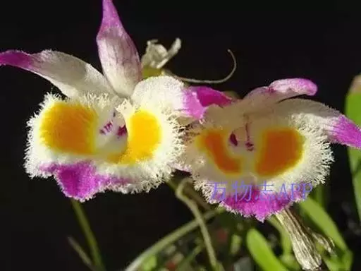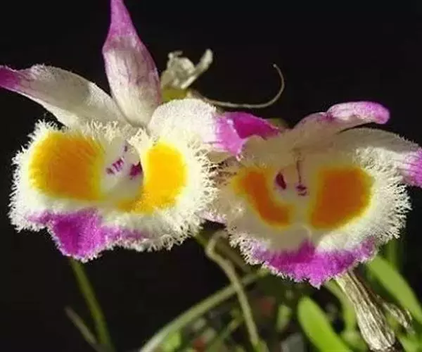 花瓣与萼片同色,卵形,长2.6厘米,宽1.3厘米,先端近急尖,基部收狭为短爪,边缘具短流苏,具3条脉,其两侧的主脉多分枝;唇瓣白色,前部紫红色,中部以下两侧具紫红色条纹,近圆形,长3厘米,基部收狭为短爪,边缘具复式流苏,上面密布短毛;唇盘两侧各具1个黄色斑块;蕊柱白色,长约3毫米,前面两侧具紫红色条纹;药帽白色,近圆锥形,顶端稍凹的,密布细乳突,前端边缘具不整齐的齿。花期4-5月。