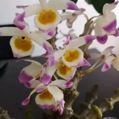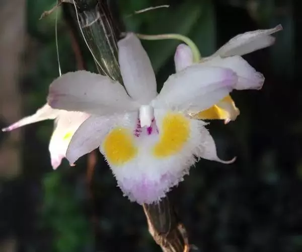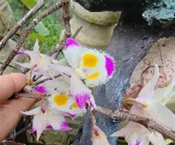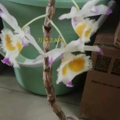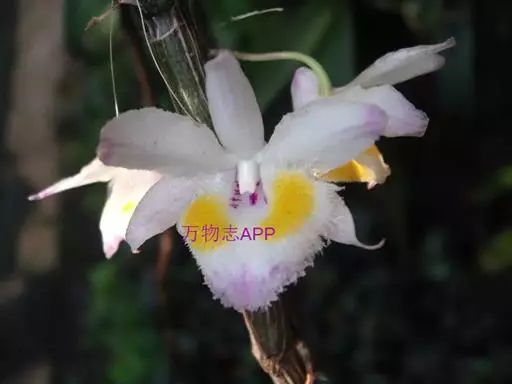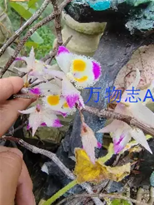 齿瓣石斛(学名:Dendrobium devonianum Paxt.):茎下垂,稍肉质,细圆柱形不分枝,具多数节。叶纸质,二列互生于整个茎上,狭卵状披针形。总状花序常数个,出自于落了叶的老茎上,每个具1-2朵花;花质地薄,开展,具香气;花瓣与萼片同色,卵形,长2.6厘米,宽1.3厘米,先端近急尖,基部收狭为短爪,边缘具短流苏,具3条脉,其两侧的主脉多分枝;唇瓣白色,前部紫红色,中部以下两侧具紫红色条纹,近圆形,长3厘米。花期4-5月。