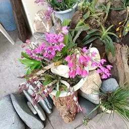 通常选用四壁多孔的塑料或陶瓷花盆,用碳根、泥炭藓、树皮块、木炭块等作盆栽材料。根据兰苗的大小,选择不同规格的花盆,但不宜用大盆栽小苗口上述栽好材料在使用前必需在清水中浸泡1天以上备用。盆底要多垫大瓦片或碎砖块,深度至盆底约1/3处,然后将兰苗放于盆中央,并在一旁插一细竹竿以固定兰苗,再填入其他栽培材料,注意根与根之间用材料隔开。