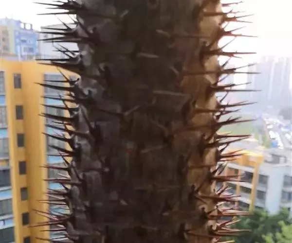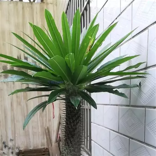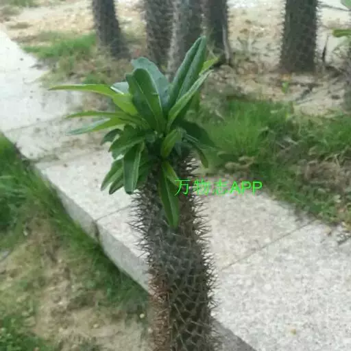 茎干肥大挺拔,高可达5米,直径可达30厘米,圆柱形、褐绿色,密生3枚一簇的银灰色的硬刺,较粗短,长2-6厘米。茎顶丛生翠绿色长广线形叶片,尖头,叶柄及叶脉淡绿色。花白色,中央黄色,直径约5-8厘米,有清香,开花期多在春季至早夏。 非洲霸王树