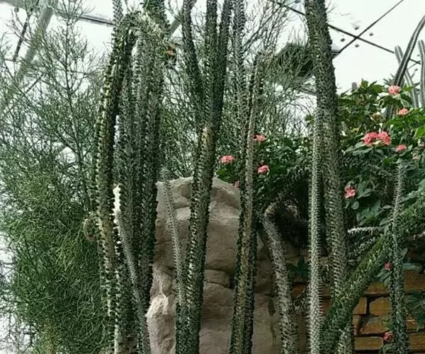 非洲霸王树为多肉植物中的珍稀品种,其适应性强,株型奇特,富有艺术性,具有较高的观赏价值,广泛应用于各种景观布置栽培。在满足植株生长习性的前提下,可与仙人掌科、大戟科、景天科等植相互搭配混栽,种植过程注意高低有序,疏密得当,做到层次分明,错落有致,粗犷与精细并存。