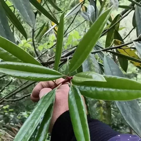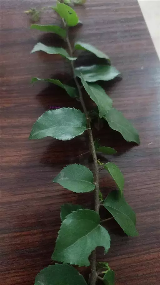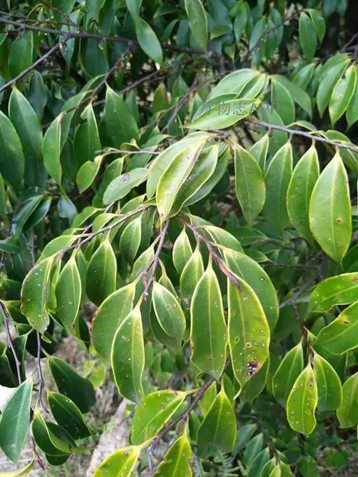 乔木,嫩枝褐色。叶薄革质,卵形、狭倒卵形、倒披针状椭圆形,长3.5-8厘米,宽1.5-3厘米,先端常呈尾状渐尖,基部楔形或圆形,边缘具浅锯齿或波状齿,有时近全缘;中脉在叶面凹下,侧脉和网脉在两面均凸起,侧脉每边4-6条;叶柄长0.5-1厘米。