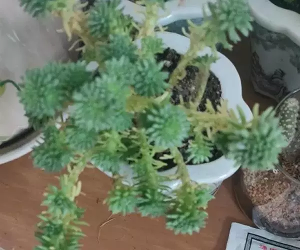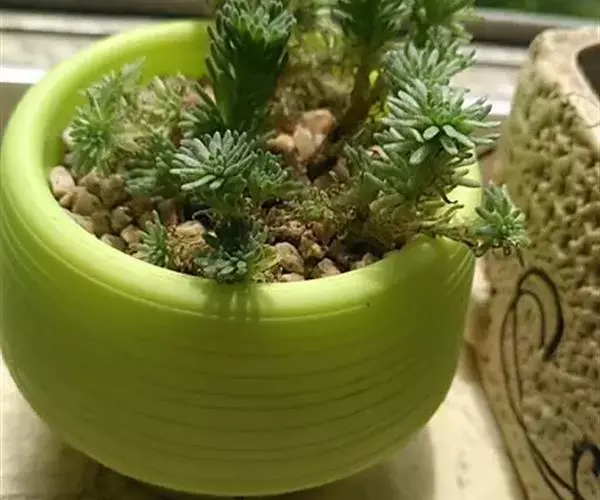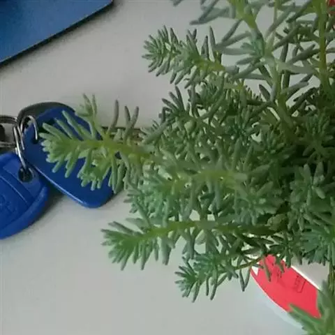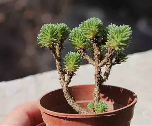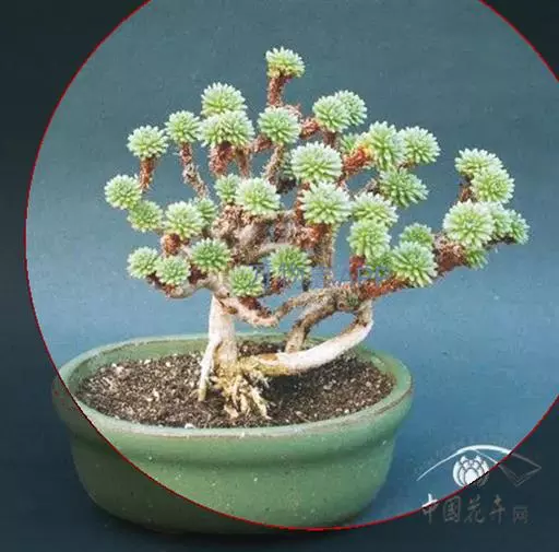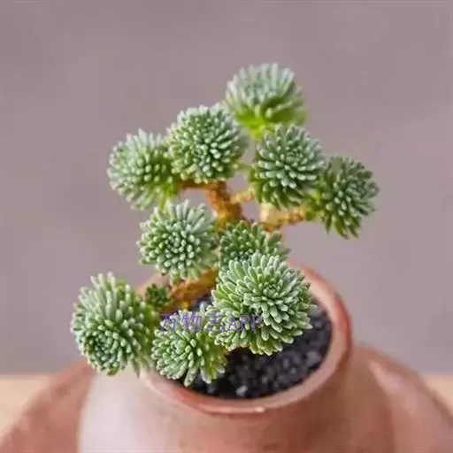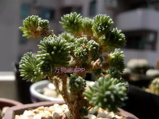 多肉植物,植株低矮,多分枝,株型近似球状,新枝浅绿色,以后逐渐转为灰白色,肉质叶近似针状,簇生于枝头,绿色或灰绿色。枝条下部的老叶容易干枯,贴在枝干上,形成类似松树皮般的龟裂,数月才脱落,露出光滑的肉质茎。小花黄色,星状。 小松绿