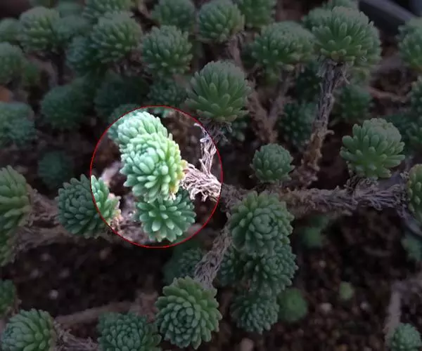 小松绿的萌发力强,容易萌发侧枝, 养护中应及时剪去过密、过乱的枝条, 尤其是基部的新枝,以保持植株的自然美观。对于修剪下来的枝条,可作为插穗进行扦插繁殖。此外,小松绿是以观叶为主的多肉植物,其花的观赏价值不高,出现花序时应及时剪去,以免消耗过多的养分。