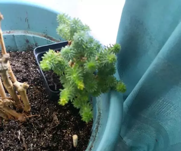 夏季高温时小松绿处于休眠状态, 植株生长基本停滞,可放在通风良好、 没有直射阳光的半阴处养护。注意控制浇水,避免雨淋,尤其是长期雨淋,以防植株腐烂死亡。到秋凉后,植株开始生长后再恢复正常管理。冬季移入室内光照充足、温度不低于10℃的地方,植株可继续生长,如果控制浇水,使植株休眠,也能耐5℃低温,甚至更低温度。