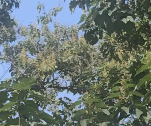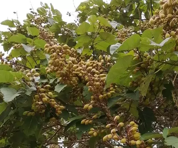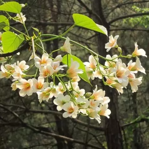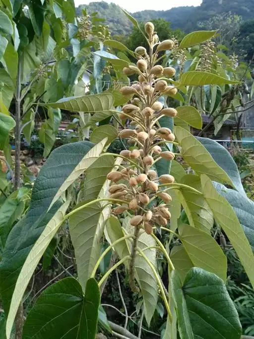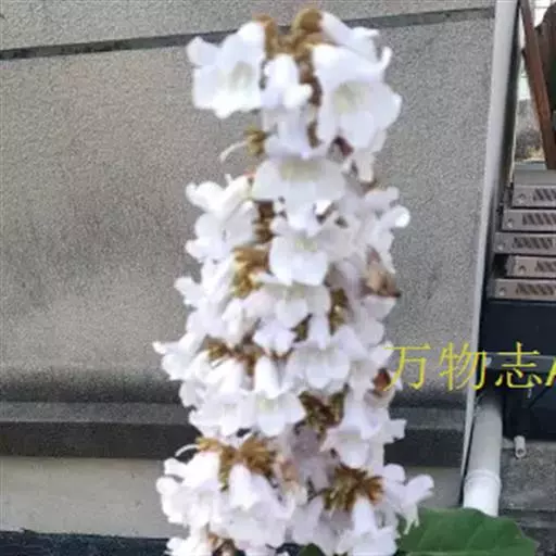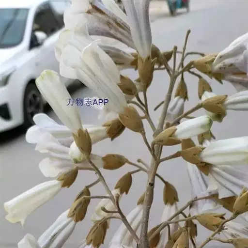 1.泡桐,乔木,高达30m。树皮灰褐色,幼枝、叶、叶柄、花序各部及幼果均被黄褐色星状绒毛。叶柄长达12cm;叶片长卵状心脏形,长可达20cm,先端长渐尖或锐尖头,基部心形,全缘。花序狭长几成圆柱形,长约25cm;小聚伞花序有花3-8朵,头年秋天生花蕾,先叶开放;总花梗与花梗近等长;花萼倒圆锥形,长2-2.5cm,5裂达1-3,裂片卵形,果期变为狭三角形;花冠管状漏斗形,白色,内有紫斑,长达10cm,筒直而向上逐渐扩大,上唇较狭,2裂,反卷,下唇3裂,先端均有齿痕状齿或凹头;雄蕊4,二强,隐藏于花冠筒内;子房2室,花柱细长,内弯。蒴果木质,长圆形,长6-10cm,室背2裂。种子多数,扁而有翅。花期2-3月,果期8-9月。