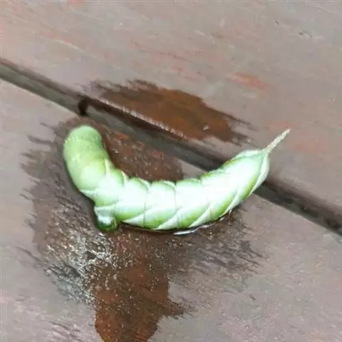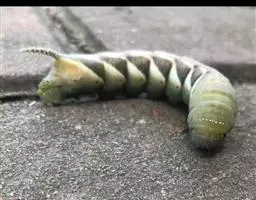 新孵化的幼虫为透明黄色,第二龄幼虫呈绿色。幼虫是绿色的,两侧有两个灰色条纹,在乳白色的边缘,乳突的典型尾部有角。口器为紫红色,最后一龄变成橘红色,呈蓝色。它们的食物完全暴露在寄主植物的顶部,并在缠在一起的茎中休息。尽管取决于温暖和阳光,但幼虫期可能会长达20天。
