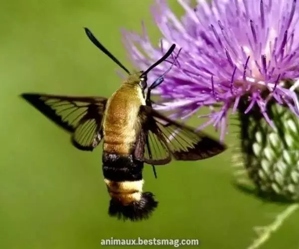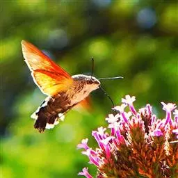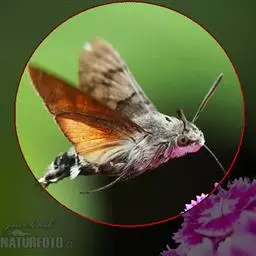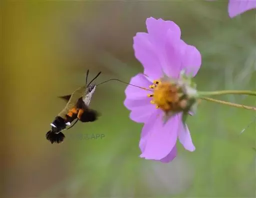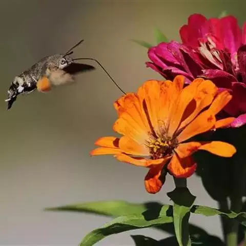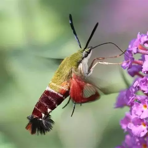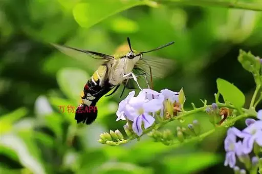 蜂鸟鹰蛾(学名:Macroglossum stellatarum):被称为昆虫世界里的“四不像”,像蝶,和蝶一样白天活动,口器是长长的喙管,且有尖端膨大的触角,还有色彩缤纷、美丽炫目的翅膀。独特而强壮,有灰褐色前翅,其上饰有黑色纹线,两性相似。幼虫白色,身体肥硕,头很小呈黑色。在干枯的瓜蒌藤中越冬。