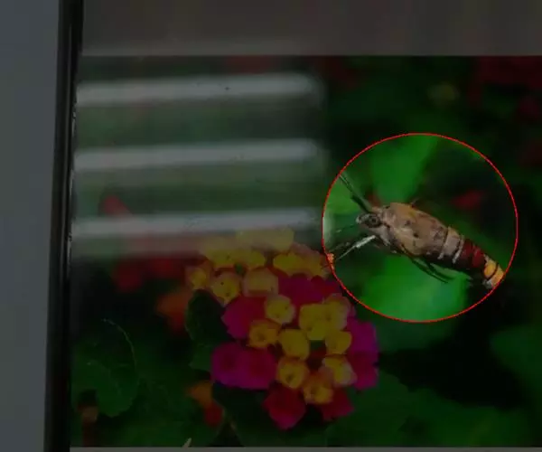 2015年9月14日,北京朝阳区酒厂艺术园D1003栋附近发现蜂鸟鹰蛾,并用高清摄影机拍下一段视频,图为截图。
