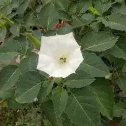 毛曼陀罗(学名:Datura innoxia Mill.)又名:凤茄花、串筋花,属管状花目,茄科一年生直立草本或半灌木状,高1-2米,茎粗壮,下部灰白色,叶片广卵形,花单生于枝叉间或叶腋,直立或斜升;花萼圆筒状而不具棱角,花冠长漏斗状,蒴果俯垂,近球状或卵球状,种子扁肾形,褐色,花果期6-9月。