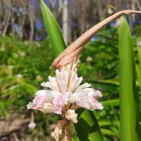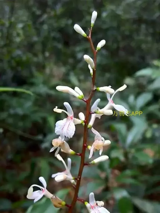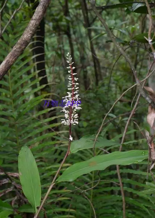 海南山姜是姜科,山姜属多年生草本植物,叶片带形,顶端渐尖并有一旋卷的尾状尖头,基部渐狭,…