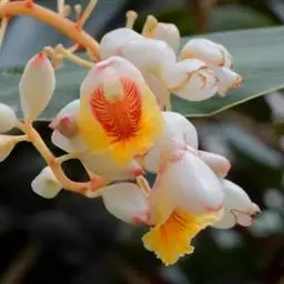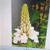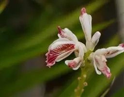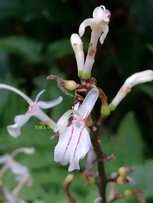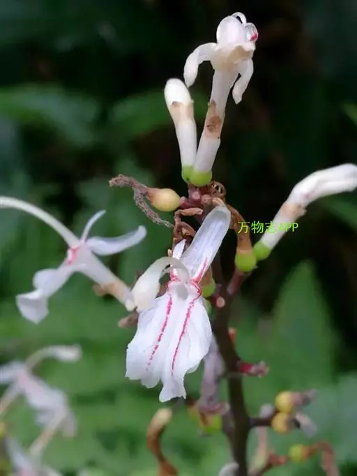 花组成狭圆锥花序,长15-30厘米,分枝短,长3-10毫米,其上有花2-4朵;小苞片长1-3毫米,花时脱落;花白色,萼管状,长5毫米,顶端具3齿;花冠管略超出,花冠裂片长圆形,长约6毫米,后方的1枚稍较大,兜状;唇瓣卵形,长6-7毫米,顶端微凹,侧生退化雄蕊2枚,钻状,长约1毫米;花丝长约5毫米,花药长约3毫米;子房无毛。