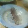 2、在调料腌的牛肉抹上面粉和鸡蛋,煎香,最后用葱丝和辣椒丝浇头 。