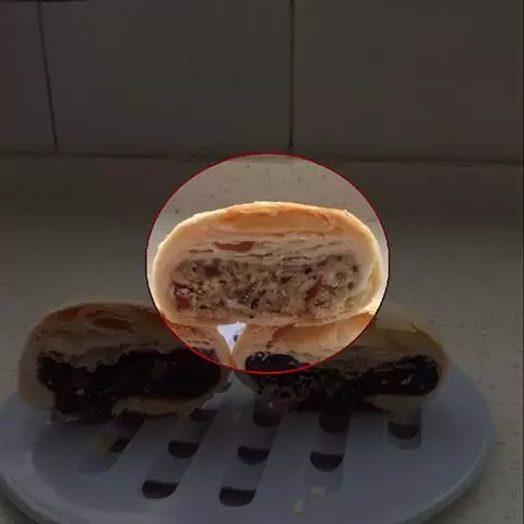 9.烤制:首先预热烤箱192℃。在装盘肉饼上层用已经打好的一个鸡蛋黄和清水刷抹,在烤箱中烘烤30分钟,外表面呈金黄色为最佳,将烤盘从烤箱中取出,并将烤箱加热至220℃。