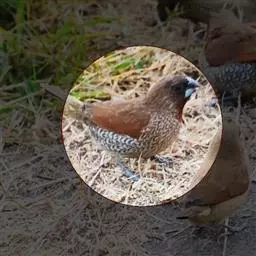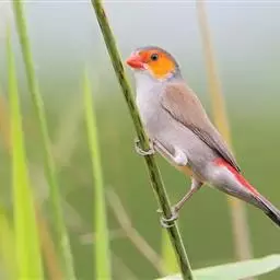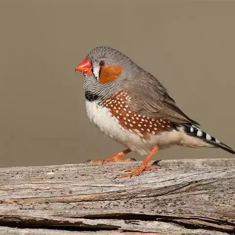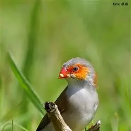 橙颊梅花雀体长约10厘米,头部灰色,两侧有大块橙色区域,嘴基及眼下方有黑纹,两条黑纹间呈白色,…
