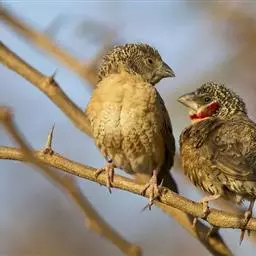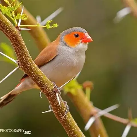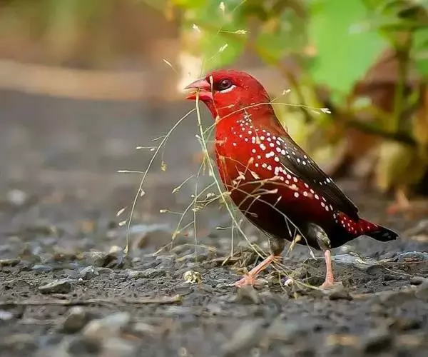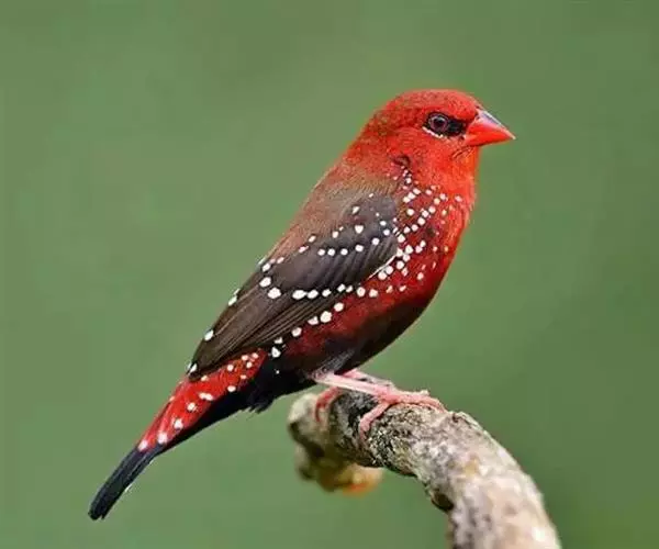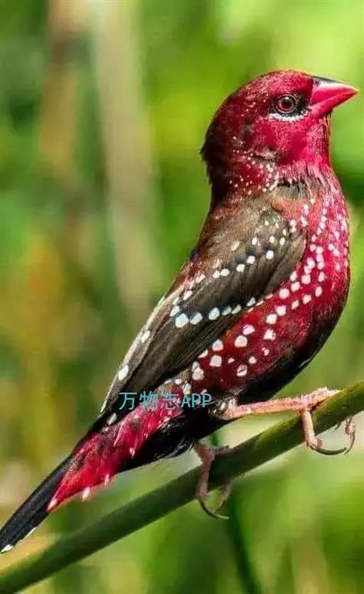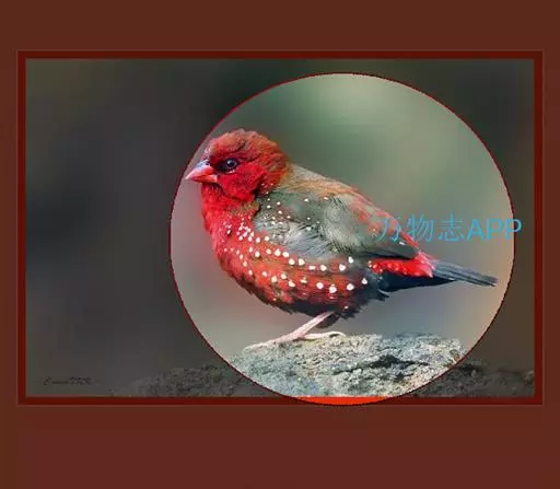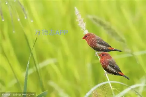 红梅花雀(Amandava amandava)小型鸟类,体长9-10厘米。雄鸟通体朱红色,背、肩、胸等满布白色小斑点,两翅和尾黑褐色均具白色端斑,嘴红色,脚蜡黄色。雌鸟上体淡褐色或赭褐色,翅上中覆羽、大覆羽和内侧飞羽末端具白色斑点,尾上覆羽红色,眼先和眼周黑色,其余头侧、颏、喉、胸和两胁灰色,其余下体橙黄色,嘴红色。