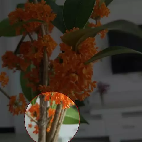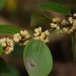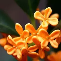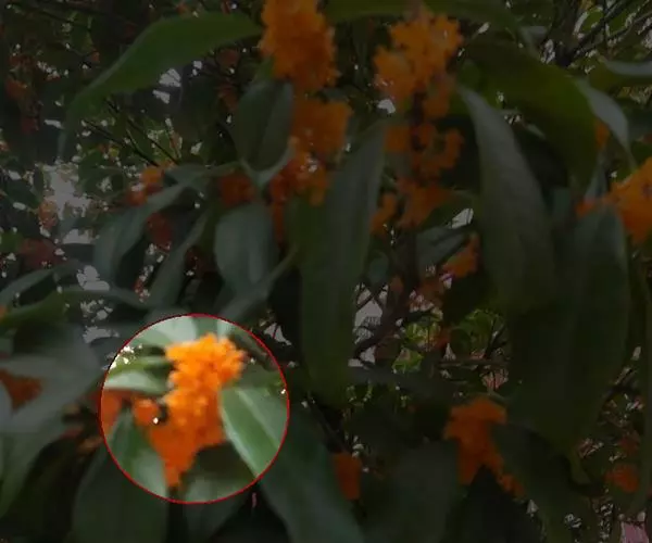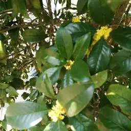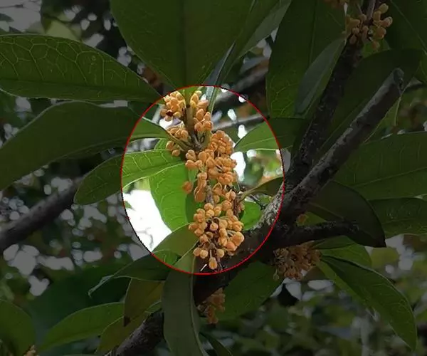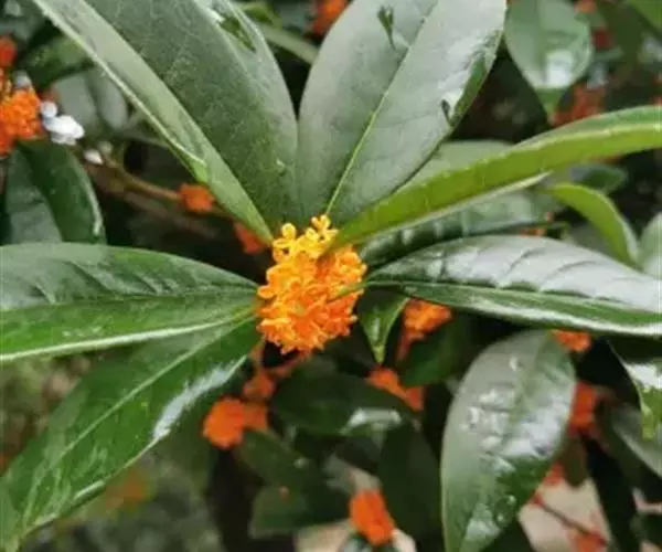 聚伞花序簇生于叶腋,或近于帚状,每腋内有花多朵;苞片宽卵形,质厚,长2-4毫米,具小尖头,无毛;花梗细弱,长4-10毫米,无毛;花极芳香;花萼长约1毫米,裂片稍不整齐;花冠黄白色、淡黄色、黄色或桔红色,长3-4毫米,花冠管仅长0.5-1毫米;雄蕊着生于花冠管中部,花丝极短,长约0.5毫米,花药长约1毫米,药隔在花药先端稍延伸呈不明显的小尖头;雌蕊长约1.5毫米,花柱长约0.5毫米。果歪斜,椭圆形,长1-1.5厘米,呈紫黑色。花期9-10月上旬,果期翌年3月。