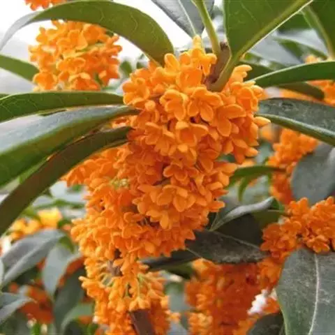 丹桂-状元红丹桂品种群:秋季开花,花色较深,橙黄、橙红至朱红色,气味浓郁,叶片厚,有“大花丹桂”、“齿丹桂”、“朱砂丹桂”、“宽叶红”等品种。