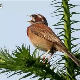 栗斑腹鹀:属小型鸣禽。体重19-25克,体长145-167毫米。头顶至背栗红色,眼先和颧纹黑褐色,…