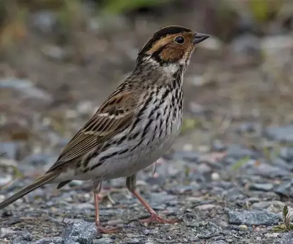 小鹀(学名:Emberiza pusilla):体重11-17克;体长115-150毫米。属小型鸣禽。喙为圆锥形,与雀科的鸟类相比较为细弱,上下喙边缘不紧密切合而微向内弯,因而切合线中略有缝隙;体羽似麻雀,外侧尾羽有较多的白色。雄鸟夏羽头部赤栗色。头侧线和耳羽后缘黑色,上体余部大致沙褐色,背部具暗褐色纵纹。下体偏白,胸及两胁具黑色纵纹。雌鸟及雄鸟冬羽羽色较淡,无黑色头侧线。虹膜褐色;上嘴近黑色,下嘴灰褐;脚肉褐色。