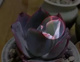 魅惑之宵叶片莲座型密集排列,底座粗壮,茎干随着生长而逐渐长粗,叶片广卵形至散三角卵形,叶面光滑 魅惑之宵 不易积水,背面突起微呈龙骨状,叶片先端急尖。叶色常年嫩绿色至黄绿色,春秋冬季昼夜温差大的情况下给足光照,叶缘至叶尖会大红或艳红。如果光照不足,则叶色浅嫩绿,叶片也会拉长,叶缘红边也会减退,只留下叶尖是红的。魅惑之宵接受充足日照叶色叶缘才会更加艳丽,株型才会更加紧实美观。魅惑之宵多年群生后,植株会非常壮观,开簇状花穗,花开微黄,先端红,五裂。