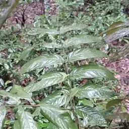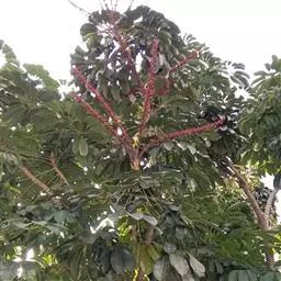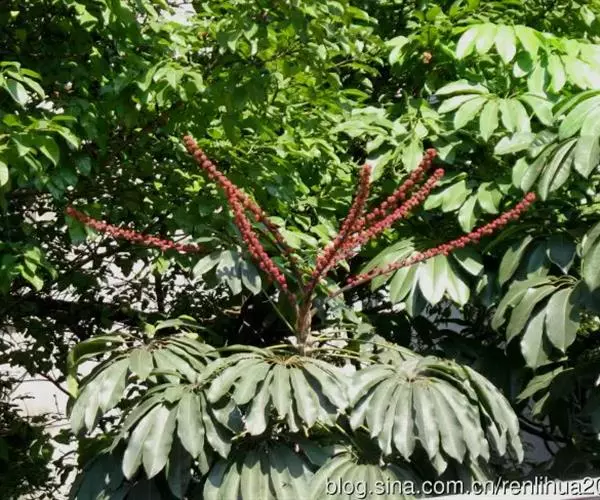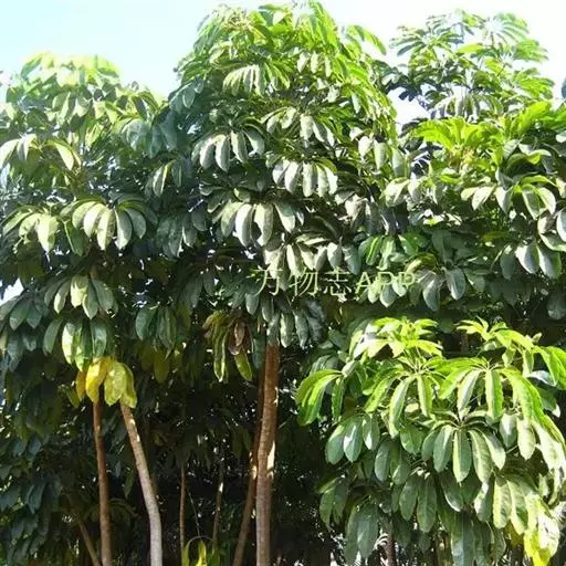 常绿乔木,高达12m。掌状复叶互生,小叶长椭圆形,全缘。花小,红色,总状花序。核果近球形,紫红色。