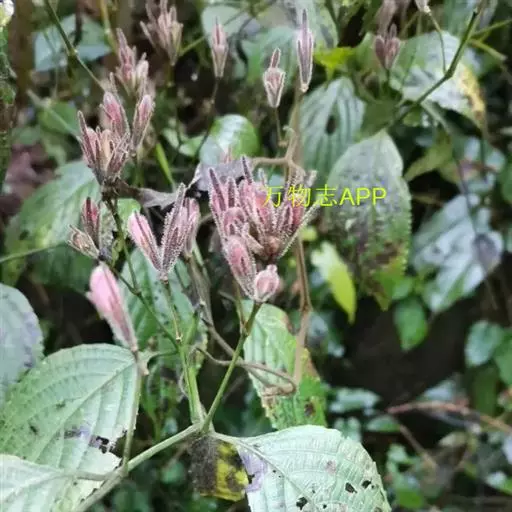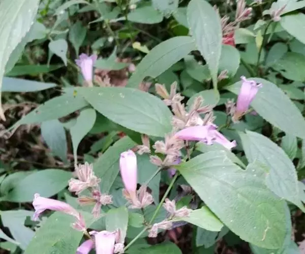 圆苞金足草多年生草本,高40-100cm。茎暗紫色,有棱,节膨大,叶对生;柄长1-4.5cm;叶片卵状椭圆形或椭圆形,长7-15cm,宽3-5cm,上部对生叶一大一小,先端长渐尖,基部楔形,边缘有锯齿,上面深绿色,脉上有短毛,下面苍绿色。花3-5朵集成头状花序;花序外有数个苞片,苞片卵状椭圆形,早落;花萼裂片5,深裂几达基部,裂片线状披针形,长7-9mm,结果时增长约达16mm,被腺毛;花冠淡红紫色,长约4cm,稍弯曲,外被短柔毛,内面无毛或在喉部有2行短柔毛,裂片5,几相等;雄蕊4,外侧一对花丝很长,内侧一对花丝极短,花丝基部有膜相连;子房上位,被毛,柱头稍弯。蒴果长1-1.8cm,有腺毛,种子4颗,长椭圆形,有微毛。花期9-10月。