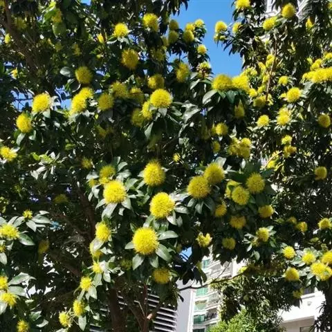 聚伞花序顶生,有花2-6朵,总梗极短;花大,白色,花梗长6-8毫米;萼管长倒锥形,长1.5-2厘米,上部宽1.5厘米,萼齿4,圆形,长6-7毫米,宽8-9毫米;花瓣分离,圆形,长2厘米;雄蕊极多,长2.5-3厘米;花柱长约4厘米。果实卵状球形,长5厘米。花期4月 。