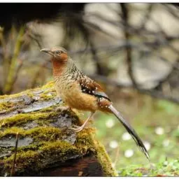 大噪鹛:中型鸟类,体长32-36厘米。额至头顶黑褐色,背栗褐色满杂以白色斑点,…