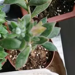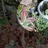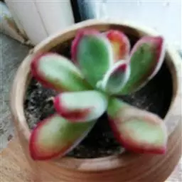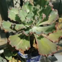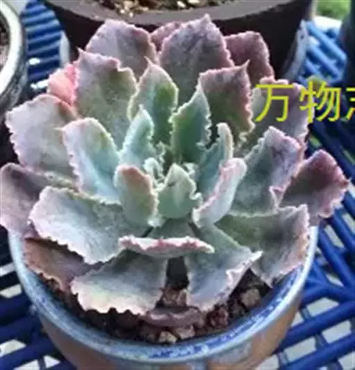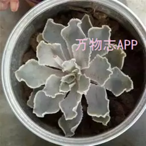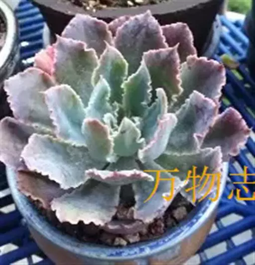 叶:倒卵形-匙形,有短尖;叶缘粉色,呈细褶状;3-5cm长,1.5-2.5cm宽,薄;浅绿色或粉色,被白霜。