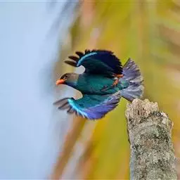 三宝鸟,是佛法僧目佛法僧科三宝鸟属中小型攀禽。成鸟通体为富有光泽的墨蓝绿色,…