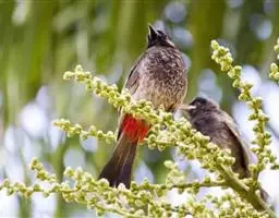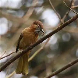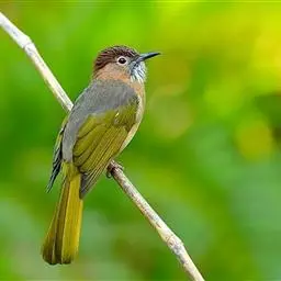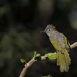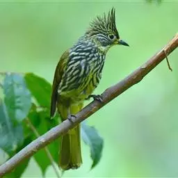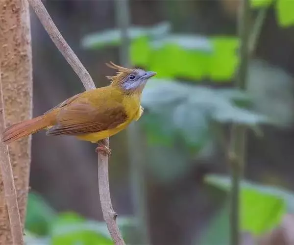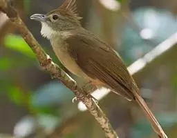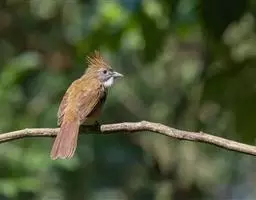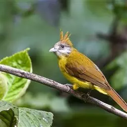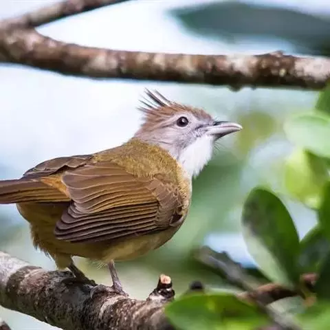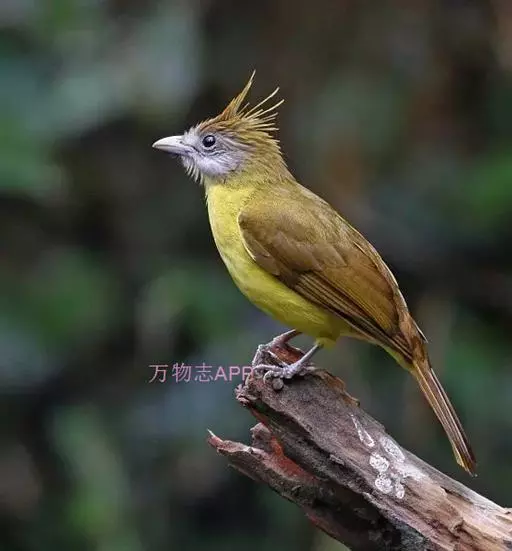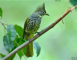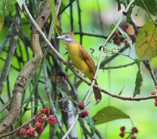白喉冠鹎:体长20-25厘米。头顶红褐色,有长而细的羽冠、红褐色,头侧灰色。上体橄榄绿黄色,…