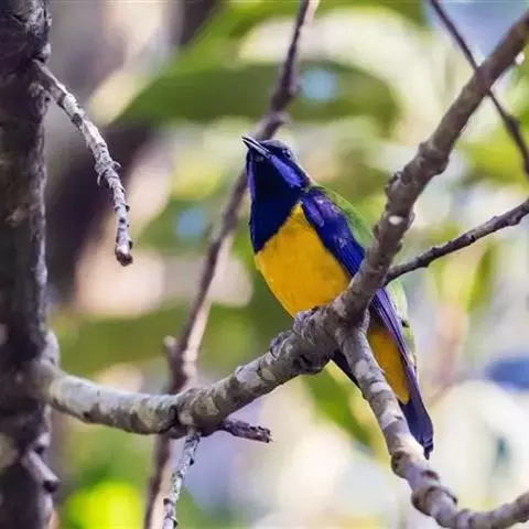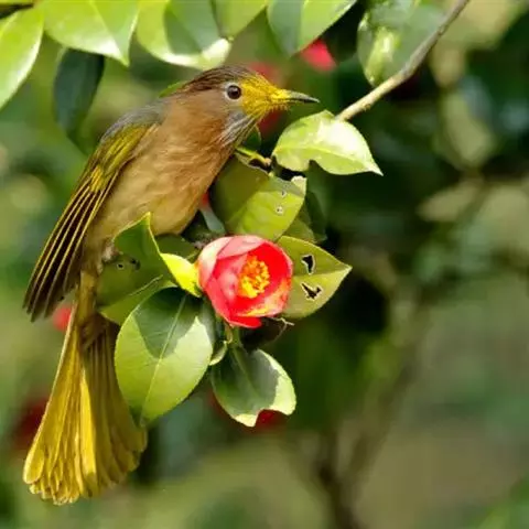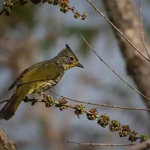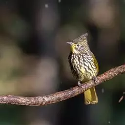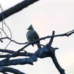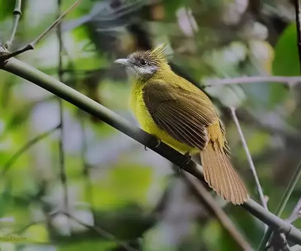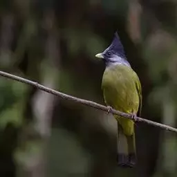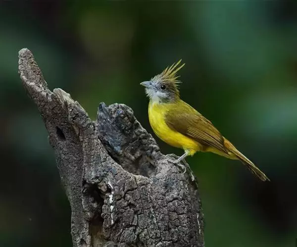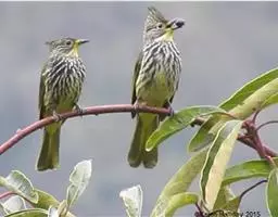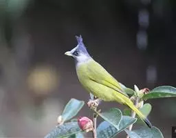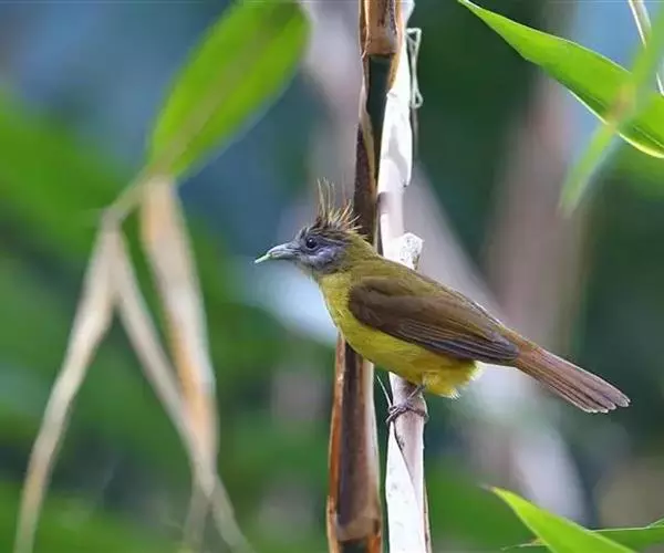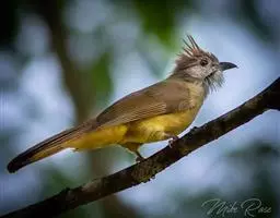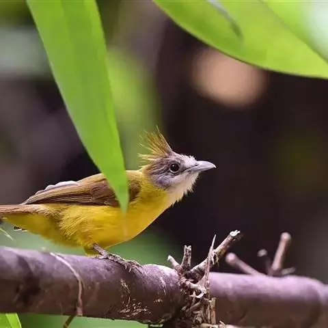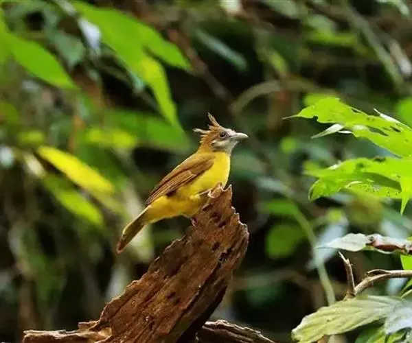 黄腹冠鹎(学名:Alophoixus flaveolus):体长19-24厘米,是一种体型略大的褐色鹎。头顶橄榄褐色具黑褐色羽冠。白色的喉膨起,下体黄色。似白喉冠鹎但较鲜亮,上体褐色较重,腹部为鲜亮的柠檬黄色。虹膜褐色;嘴黑色;脚粉红色。
