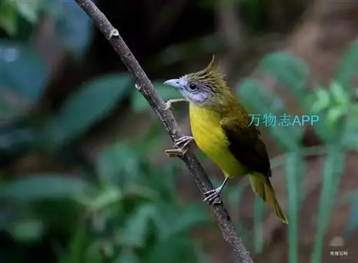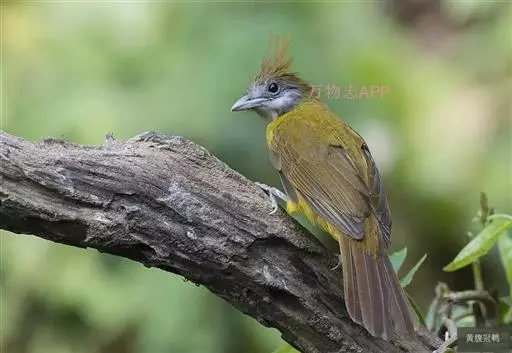 黄腹冠鹎:体长19-24厘米,是一种体型略大的褐色鹎。头顶橄榄褐色具黑褐色羽冠。白色的喉膨起,…