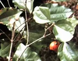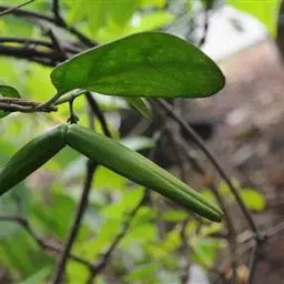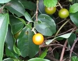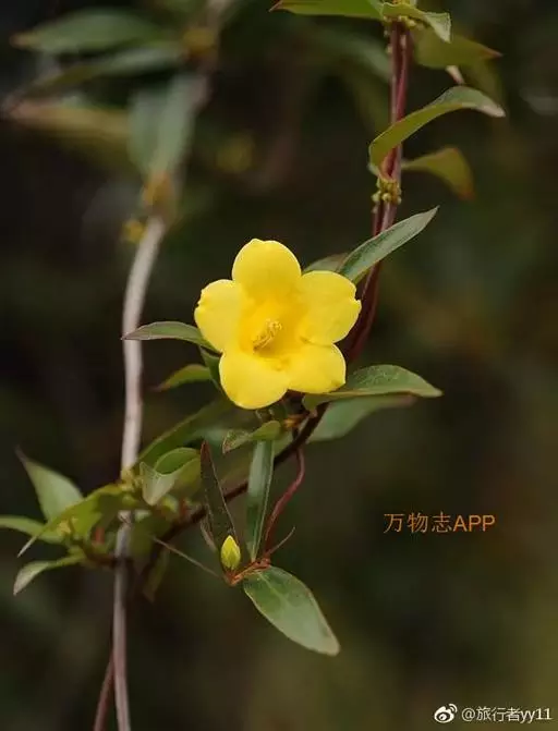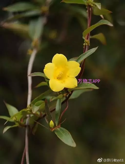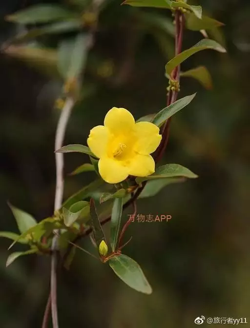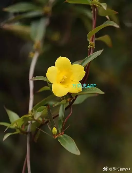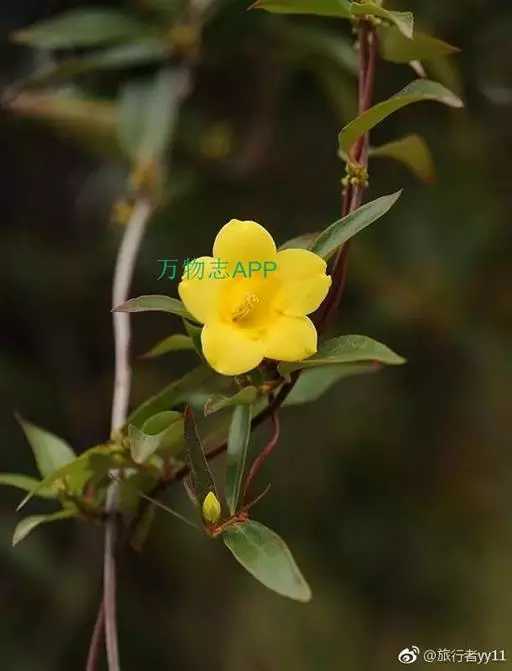 常绿钩吻藤 攀援性灌木,常绿。叶对生,披针形,长6厘米,表面有光泽,先端尖,全缘或疏生波纹,背面稍淡;花单生或成小型聚伞花序,出自叶腋,花漏斗形,五裂,裂片圆形,先端稍凹,鲜黄色有香气,长4厘米,雄蕊5,萼绿色有钝裂,着生于有鳞片的短花梗上,花期3月下旬至5月初。果实为长2厘米的蒴果,2果瓣;种子有膜翅。