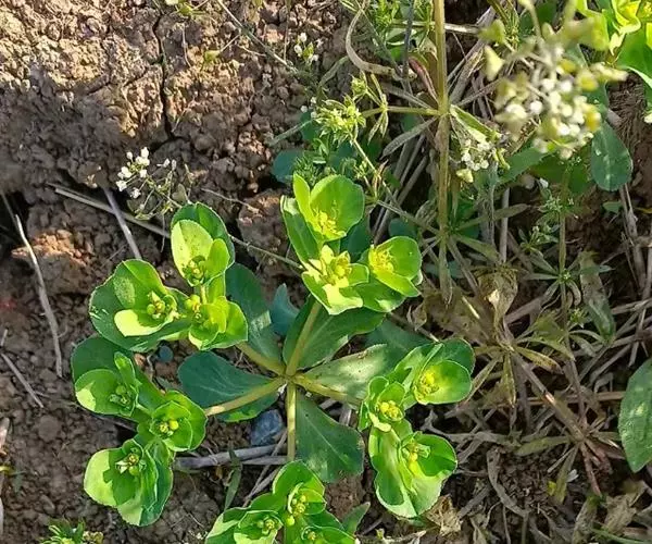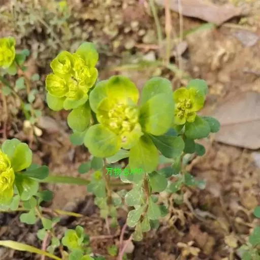 一年生或二年生草本,高10~750px,全株含乳汁。茎基部分枝,带紫红色。叶互生,倒卵形或匙形,长1~75px,宽0.7~25px,先端微凹,边缘中部以上有细锯齿,无柄。茎顶有5片轮生的叶状苞;总花序多歧聚伞状,顶生,有5伞梗,每伞梗生3个小伞梗,每小伞梗又第3回分为2叉; 杯状聚伞花序钟形,总苞顶端4裂,裂间腺体4,肾形;子房3室,花柱3。蒴果无毛。种子卵形,表面在凸起的网纹。花期4~5月,果期6~7月。生于沟边、路旁、田野。分布于除新疆、西藏以外的全国各省区。