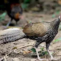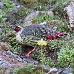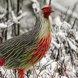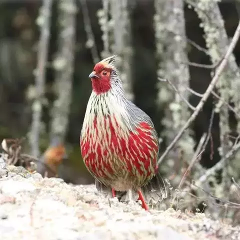 血雉雉科血雉属鸟类,别名血鸡、松花鸡,血雉的雄鸟大覆羽、尾下覆羽、尾上覆羽、脚、头侧、腊膜为红色,…