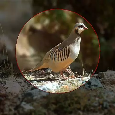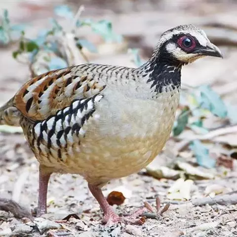 体大的灰褐色鹑类。胸灰色具黑色细纹。与相似种类四川雉鹑不同处在于栗色喉块外缘近白。有猩红色眼周裸皮。…