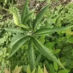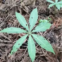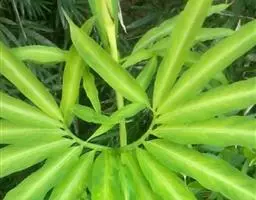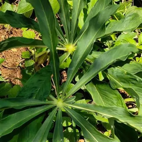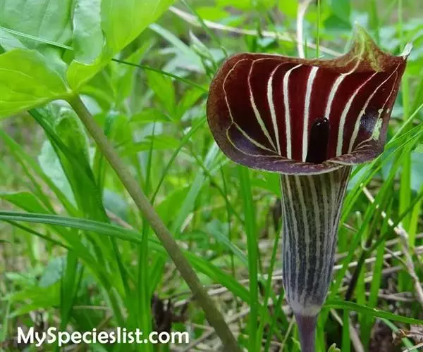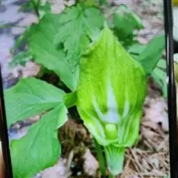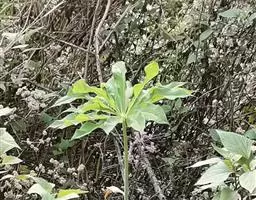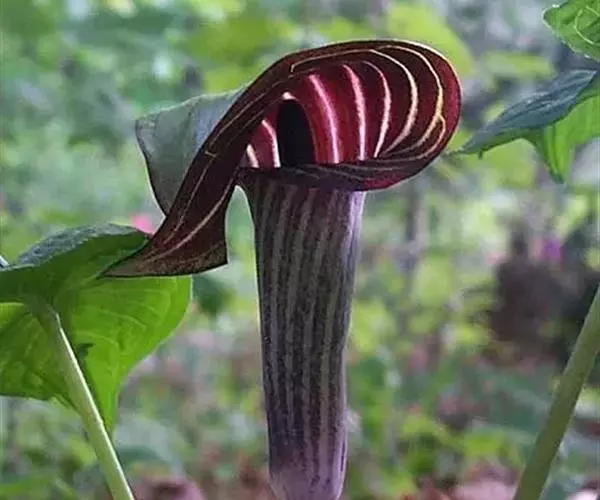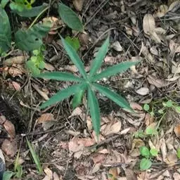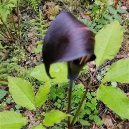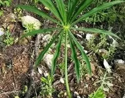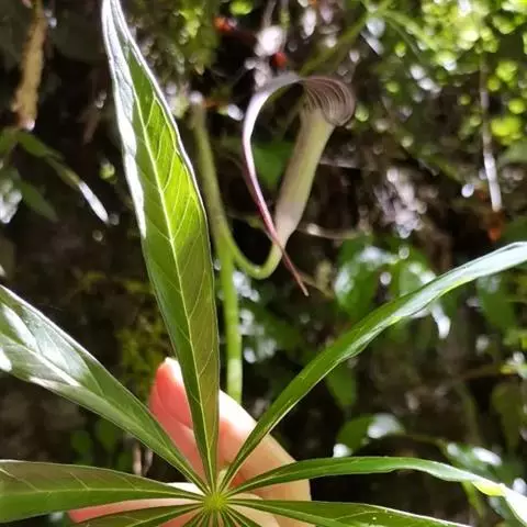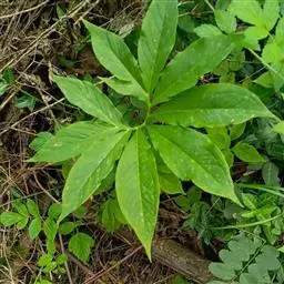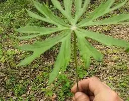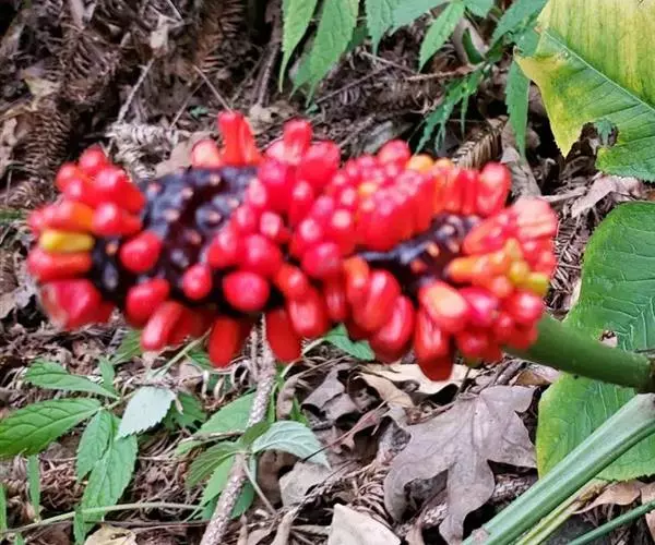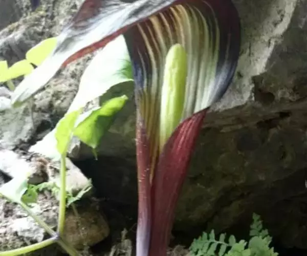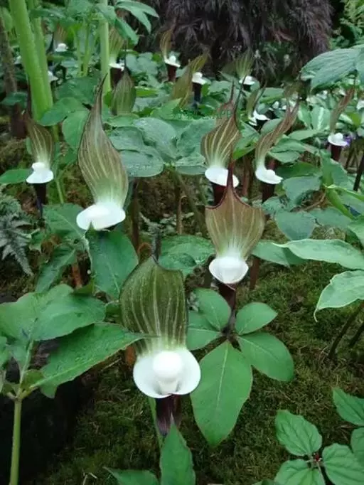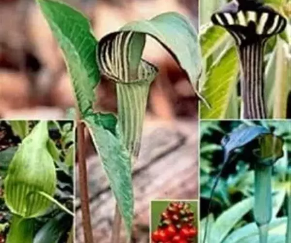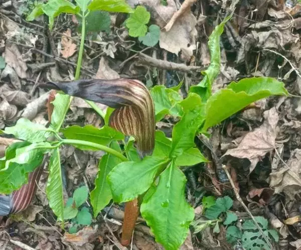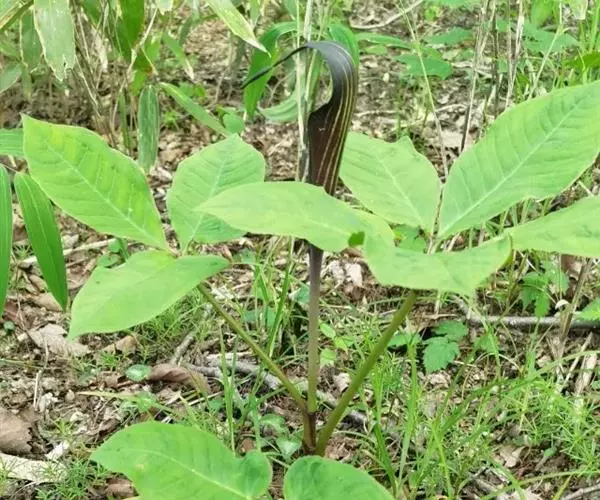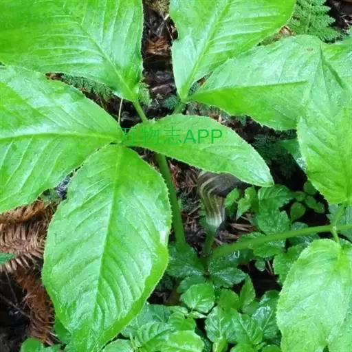 灯台莲:又名粗齿灯台莲。多年生草本。块茎扁球形,直径2-3cm。鳞叶2,内面的披针形,膜质;叶2,叶柄长20-30cm,下面1/2鞘筒状,鞘筒上缘几平截;叶片鸟足状5裂,裂片卵形、卵状长圆形或长圆形,边缘具不规则的粗锯齿至细的啮状锯齿,中裂片具长柄,侧裂片与中裂片近相等,具短柄或否;外侧裂片无柄,不等侧,内侧基部楔形,外侧圆形或耳状。花序柄通常短于叶柄或几等长。佛焰苞淡绿色至暗紫色,具淡紫色条纹,管部漏斗状,喉部边缘近截形,无耳;檐部卵状披针形,稍下弯;肉穗花序单性;雄花序圆柱形,花疏,雄花药2-3,药室外向纵裂;雌花序近圆锥形,花密,子房卵圆形,柱头小;各附属器具细柄,上部增粗成棒状或近球形。浆果黄色,长圆锥状。种子卵圆形,具柄。花期5月,果期8-9月。