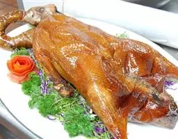 烤鸭 新中国建立后,北京烤鸭的声誉与日俱增,更加闻名世界。据说周总理生前十分欣赏和关注这一名菜,宴请外宾,品尝烤鸭。为了适应社会发展需要,而今鸭店的烤制操作已逾加现代化,风味更加珍美。烤鸭家族中最辉煌的要算是全聚德了,是它确立了烤鸭家族的北京形象大使地位。“全聚德”的创始人杨全仁早先是个经营生鸡鸭生意的小商,积累资本后开创了全聚德烤鸭店,聘请了曾在清宫御膳房当差的一位烤鸭师傅,用宫廷的“挂炉烤鸭”技术精致烤鸭,使得“挂炉烤鸭”在民间繁衍开来。全聚德采取的是挂炉烤法,不给鸭子开膛。只在鸭子身上开个小洞,把内脏拿出来,然后往鸭肚子里面灌开水,然后再把小洞系上后挂在火上烤。这方法既不让鸭子因被烤而失水又可以让鸭子的皮胀开不被烤软,烤出的鸭子皮很薄很脆,成了烤鸭最好吃的部分。挂炉有炉孔无炉门,以枣木、梨木等果木为燃料,用明火。果木烧制时,无烟、底火旺,燃烧时间长。鸭子入炉后,要用挑杆有规律地调换鸭子的位置,以使鸭子受热均匀,周身都能烤到。烤出的鸭子外观饱满,颜色呈枣红色,皮层酥脆,外焦里嫩,并带有一股果木的清香,细品起来,味道更加美妙。严格地说,只有这种烤法才叫北京烤鸭。
