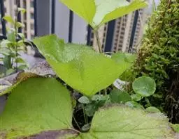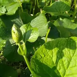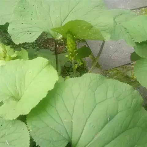茎细直,直径约5-7毫米,无毛。叶有基部扩大抱茎的长柄,叶片宽过于长,宽16-30厘米,基部稍心形,掌状深裂,裂片约7个,中裂片3裂,侧裂片2-3裂,边缘有疏齿或小裂片,质稍厚,下面浅绿色,两面无毛;上部叶少数,有基部扩大抱茎的短柄,有时有3裂片或不裂而作狭长的苞叶状。