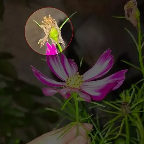 舌状花2-3,黄色,舌片线状长圆形,长达17毫米,宽2-3毫米,先端钝,透明,管部长6-7毫米;管状花常3个,远出于总苞之上,长10-12毫米,管部与檐部等长,花柱细长,冠毛紫褐色,长约4 毫米,短于管部。