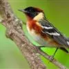 红腰朱雀:体长12-14厘米,小型鸟类。雄鸟前额和眉纹玫瑰粉红色,头顶和一宽的贯眼带深红褐色,背红…