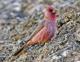 藏朱雀:全长约17-18厘米。雄鸟头部深红色具光辉,喉部暗红色具白色点斑;背部灰白色,各羽具玫瑰红…