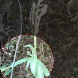 花茎直立,被以覆瓦状疏离的鳞片,穗状花序卵形至椭圆形,长约5厘米,宽约2.5厘米,苞片卵形,淡绿色;花稠密,长约2.5厘米,先端锐尖,萼短筒状,花冠3裂,裂片披针形,黄色,唇瓣较短,长圆状倒卵形,呈淡紫色,有黄白色斑点,下部两面三刀侧各有小裂片;雄蕊1枚,挺出,子房下位,花柱丝状,淡紫色,柱头放射状。蒴果长圆形胀约2.5厘米,花期6-8月。