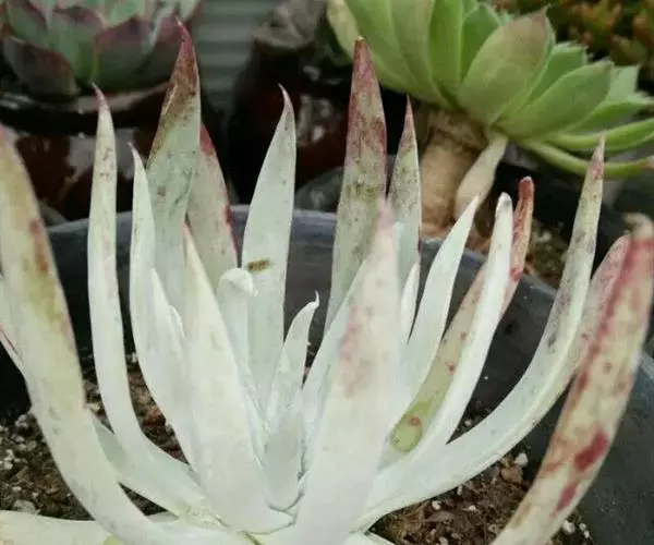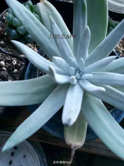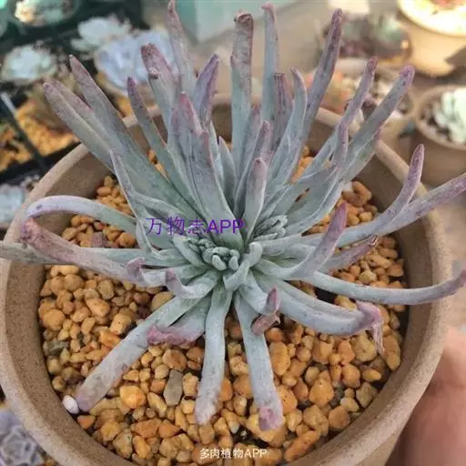 仙女杯 布瑞东尼 Dudleya brittonii,在墨西哥北部近海沿岸,蒂华纳以南,拉米西恩附近均有分布。植物学家布瑞登发现该品种为此命名,故名布瑞东尼,也有以其叶片宽大特征,直接叫做宽叶仙女杯。 仙女杯 布瑞东尼 这基本上是众人所知,园艺培养、家庭养殖,最为常见的一种仙女杯品种,形态多变,肉质叶片上白粉浓厚,白色纯净,上佳植株微现翠绿叶色。此品种分2种季节形态,视生长环境等因素(迄今研究尚无定论)。一种形态为叶面着浓厚白粉,一种形态为翠绿叶面极微量粉形态。花期四月至七月,花开黄色,染色体为N.17。 仙女杯 布瑞东尼属大型品种,不怕折腾,易于盆栽,亦益于盆栽。因为以此品种为母本或者副本的杂交品种较多,所以植株幼苗期难以分辨,购买时需确认母本父本以便保证购买为意向所需。 仙女杯 布瑞东尼 Dudleya brittonii在美国加州珲廷顿植物园